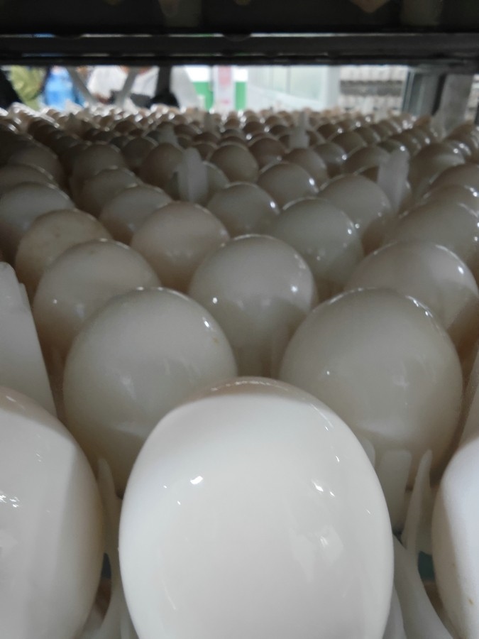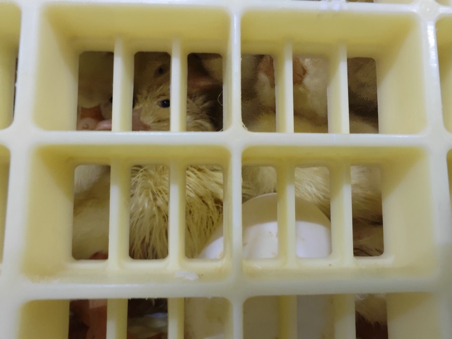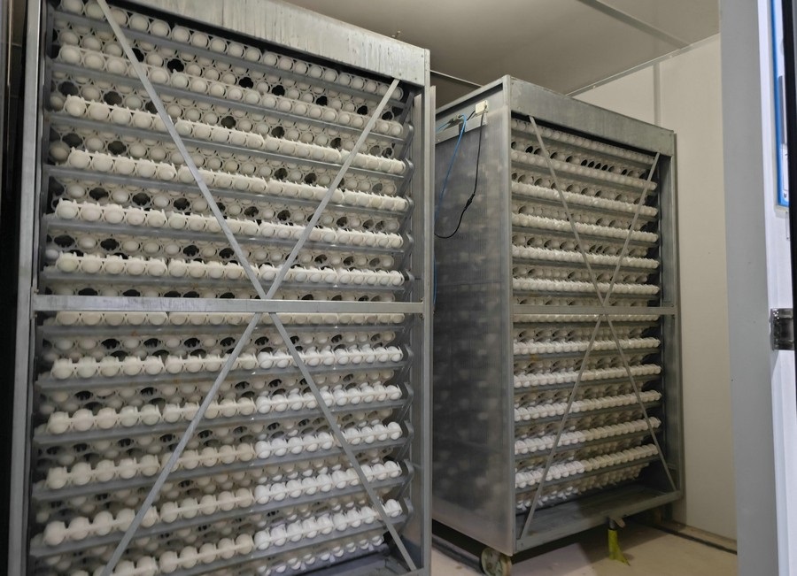 選蛋、稱重、儲(chǔ)蛋、洗蛋、孵化、落盤、出雛、出苗……經(jīng)過一系列程序,并經(jīng)過25天的孵化后,種蛋由孵化車轉(zhuǎn)移到出雛筐,在此等待3天,就完成了由蛋到苗的蛻變。