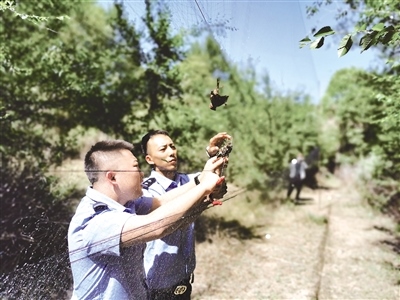 民警在周邊偵查,尚未發(fā)現(xiàn)可疑實施人員,民警及時對網(wǎng)上受困的野鳥進行了解救和放飛,并對該處粘鳥網(wǎng)進行了拆除、銷毀。