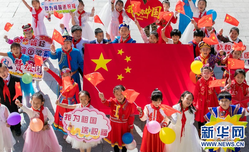 9月29日,內(nèi)蒙古呼和浩特市玉泉區(qū)五塔寺東街小學(xué)學(xué)生在主題快閃活動(dòng)上,祝福偉大祖國(guó)繁榮昌盛。新華網(wǎng)發(fā)(丁根厚攝)
