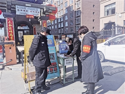 記者跟隨工作人員來到轄區(qū)地新街坊小區(qū),幾名社區(qū)工作人員正在小區(qū)門口負責疫情防控,“您好!請問您去哪棟樓?請下車登記信息。謝謝!”“請居民佩戴好口罩”……針對出入小區(qū)的人員,社區(qū)工作人員都一一仔細核查,宣傳防疫信息?!按汗?jié)長假過后,很多事都堆到今天了,所以格外忙。”阿拉善北路社區(qū)黨總支書記王海瓊說,阿拉善北路社區(qū)很多網(wǎng)格員都放棄了與家人團聚的時間,主動下沉到各個小區(qū)開展疫情防控工作,實行24小時輪崗制,做好外地返呼人員登記和掃碼工作,保證轄區(qū)防控安全。除此之外,還積極參與禁燃煙花爆竹、垃圾分類宣傳等工作,讓政策落到實處。