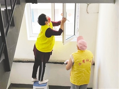 三順店社區(qū)工作者為祥和五區(qū)樓道打掃衛(wèi)生。