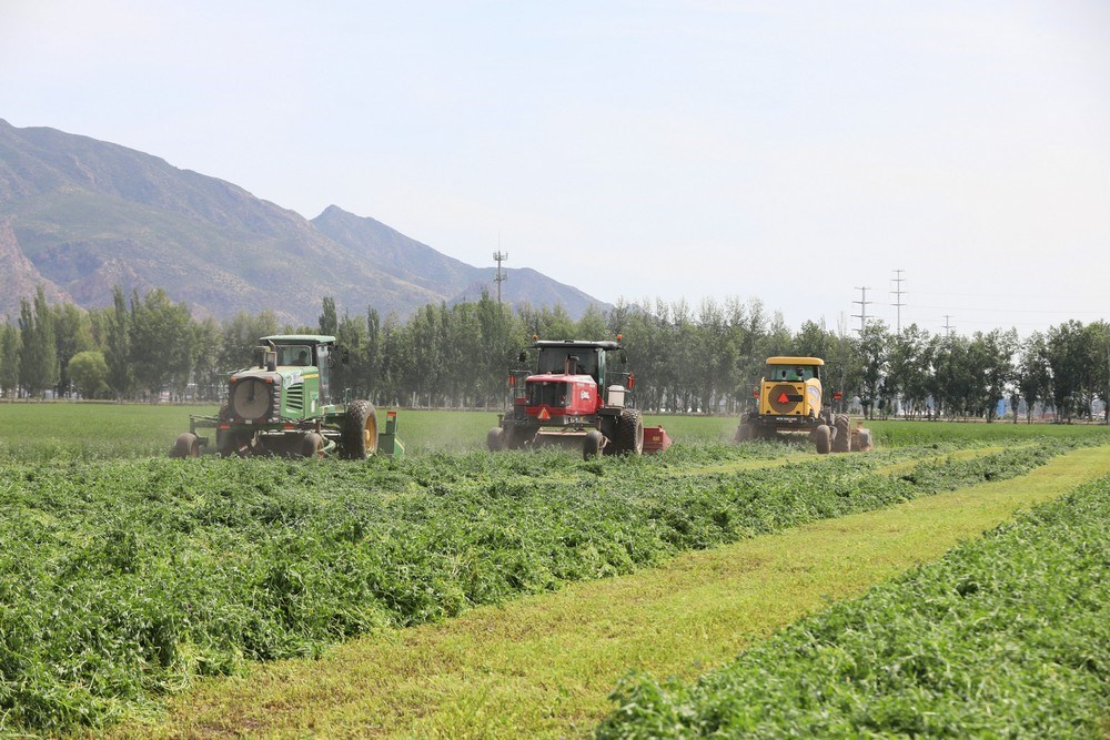 紫花苜蓿是多年生草本植物,因其產(chǎn)量高、生長周期短、再生能力強(qiáng),是優(yōu)質(zhì)的高蛋白牧草。當(dāng)天,收割令一下,3臺(tái)大型收割機(jī)械同時(shí)開動(dòng),如同巨輪駛?cè)刖G色海洋,場面壯觀。割下的紫花苜蓿就地晾曬,待苜蓿中水分含量下降后,再進(jìn)行粉碎、裹包,然后進(jìn)行貯存,提供給牧場作為青貯飼料。