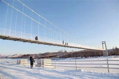 新建的“守望相助橋”橫跨根河兩岸,連接市區(qū)和蒼狼山原生態(tài)景區(qū),是一處集自然景觀和人文景觀于一體的新景點。橋面距離封凍的冰河十幾米高,造型優(yōu)美、張力十足。橋梁只供行人通過,站在橋上看過去,腳下是清澈透明的冰河,遠處是原始森林,獨特的美景盡收眼底。