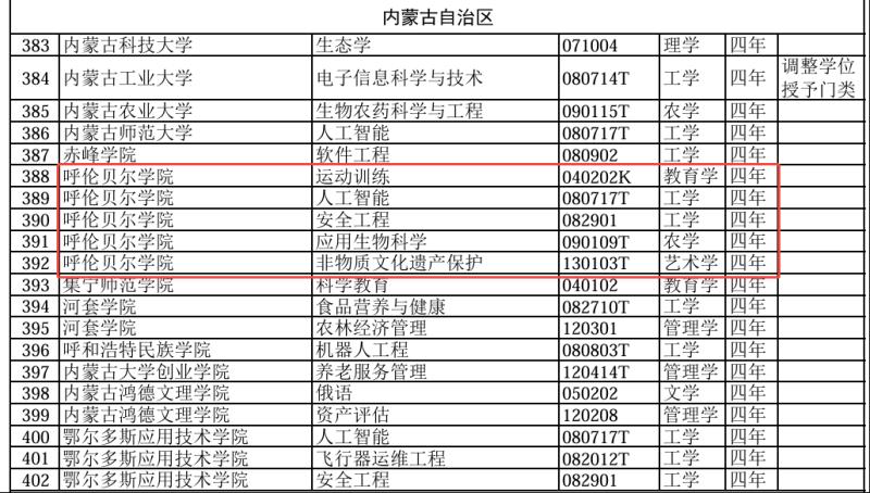 近日,教育部公布了《2024年度普通高等學(xué)校本科專業(yè)備案和審批結(jié)果》,其中,呼倫貝爾學(xué)院申報的“運(yùn)動訓(xùn)練”(專業(yè)代碼040202K,教育學(xué))、“人工智能”(專業(yè)代碼080717T,工學(xué))、“安全工程”(專業(yè)代碼082901,工學(xué))、“應(yīng)用生物科學(xué)”(專業(yè)代碼090109T,農(nóng)學(xué))、“非物質(zhì)文化遺產(chǎn)保護(hù)”(專業(yè)代碼130103T,藝術(shù)學(xué))5個本科專業(yè)成功獲批。本次備案和審批的相關(guān)專業(yè),擬列入該校2025年本科招生計劃。