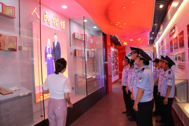 習(xí)近平新時代中國特色社會主義思想實踐基地由四子王旗委政府于2021年5月建成,總面積460平米,展廳內(nèi)展出圖片241張、文字展板34塊、視頻資料12個,分黨史學(xué)習(xí)教育、都貴瑪先進(jìn)事跡、新時代文明實踐中心三個展廳,力圖打造成鞏固民族團結(jié)大局、鑄牢中華民族共同體意識的紅色教育主陣地。在黨史學(xué)習(xí)教育展廳,全體黨員民警通過多媒體技術(shù),深入了解了黨的歷次代表大會主要內(nèi)容、我們黨理論探索的發(fā)展歷程和中國共產(chǎn)黨人的精神譜系以及習(xí)近平總書記對內(nèi)蒙古的重要囑托,重溫了習(xí)近平總書記“七一”重要講話精神,引導(dǎo)黨員民警牢記初心使命,時刻銘記黨性是黨員立身、立業(yè)、立德的基石。在都貴瑪先進(jìn)事跡展廳,大家通過視頻、照片、文字、連環(huán)畫等方式細(xì)致了解了“草原母親”都貴瑪養(yǎng)育28名孤兒和挽救40多位產(chǎn)婦的感人事跡,共同回憶了都貴瑪老人與邊防官兵、移民管理警察相處的點點滴滴。大家被都貴瑪老人身上“初心如炬 大愛無疆”的精神深深折服,深切感受到榜樣的力量。在新時代文明實踐中心展廳,大家還了解到駐地四子王旗新時代文明實踐工作的重要舉措和成果,通過對照人民楷模和道德模范,深入開展深刻檢視,進(jìn)一步強化了黨員民警建設(shè)美麗邊疆、維護安全穩(wěn)定的信心決心。