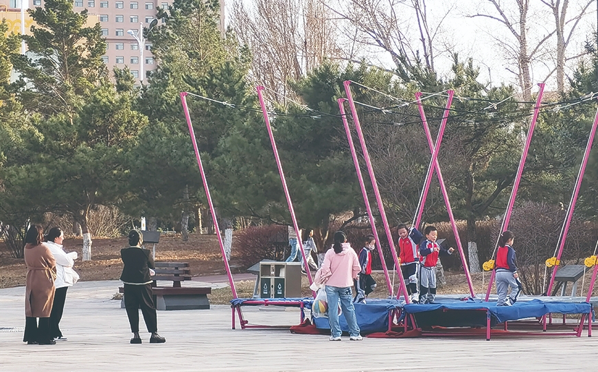 市民帶著孩子在戶外玩耍 張玥 攝