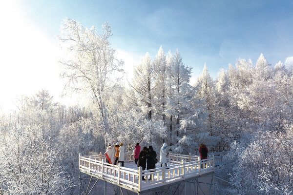 冬天的阿爾山,千里冰封,萬里雪飄,呈現(xiàn)出一片純凈無瑕的白雪世界。晶瑩剔透的霧凇裝點(diǎn)其間,宛如冰雪童話。藍(lán)天映襯下,霧凇閃耀著銀白光芒,群山峻嶺被冰封玉塑,更有一道彩虹橫跨山巔,美不勝收。木棧道深入森林,所見皆是雪與霧凇交織的白茫茫景象。漫步其間,穿越過膝積雪,那玉樹瓊花、銀光閃爍的壯美雪景讓人流連忘返。 (記者 畢力格 攝)