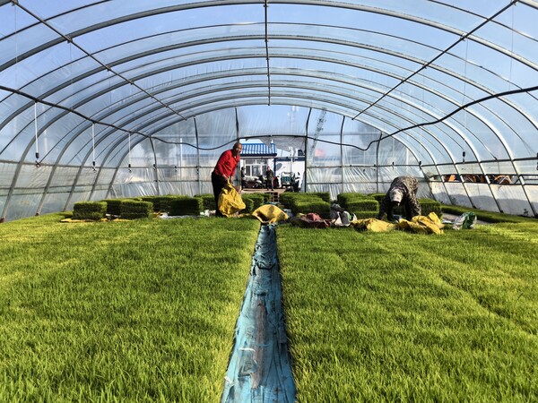 水稻種植戶(hù)將秧苗擺放在編織袋上,等待無(wú)人機(jī)運(yùn)送