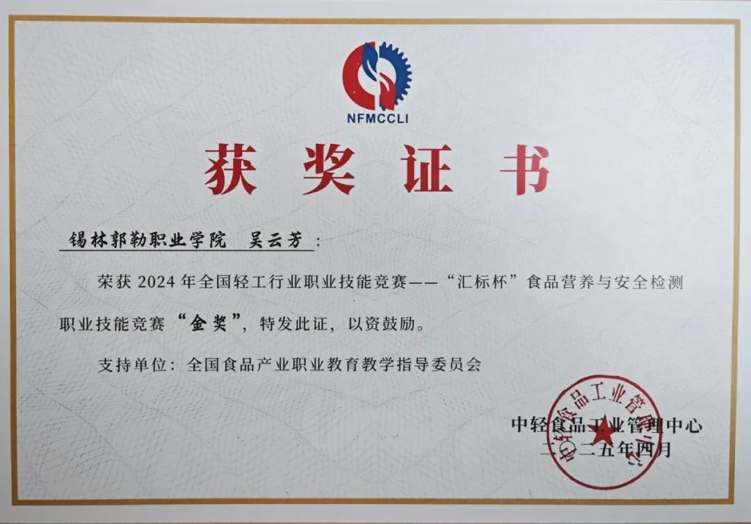 2025年4月21日,由中國輕工業(yè)聯(lián)合會、中輕食品工業(yè)管理中心、全國食品產(chǎn)業(yè)職業(yè)教育教學指導委員會等聯(lián)合舉辦的2024年全國輕工行業(yè)職業(yè)技能競賽——“匯標杯”食品營養(yǎng)與安全檢測職業(yè)技能競賽總決賽在廣州圓滿落幕。錫林郭勒職業(yè)學院食品檢測中心總工程師吳云芳同志榮獲金獎。