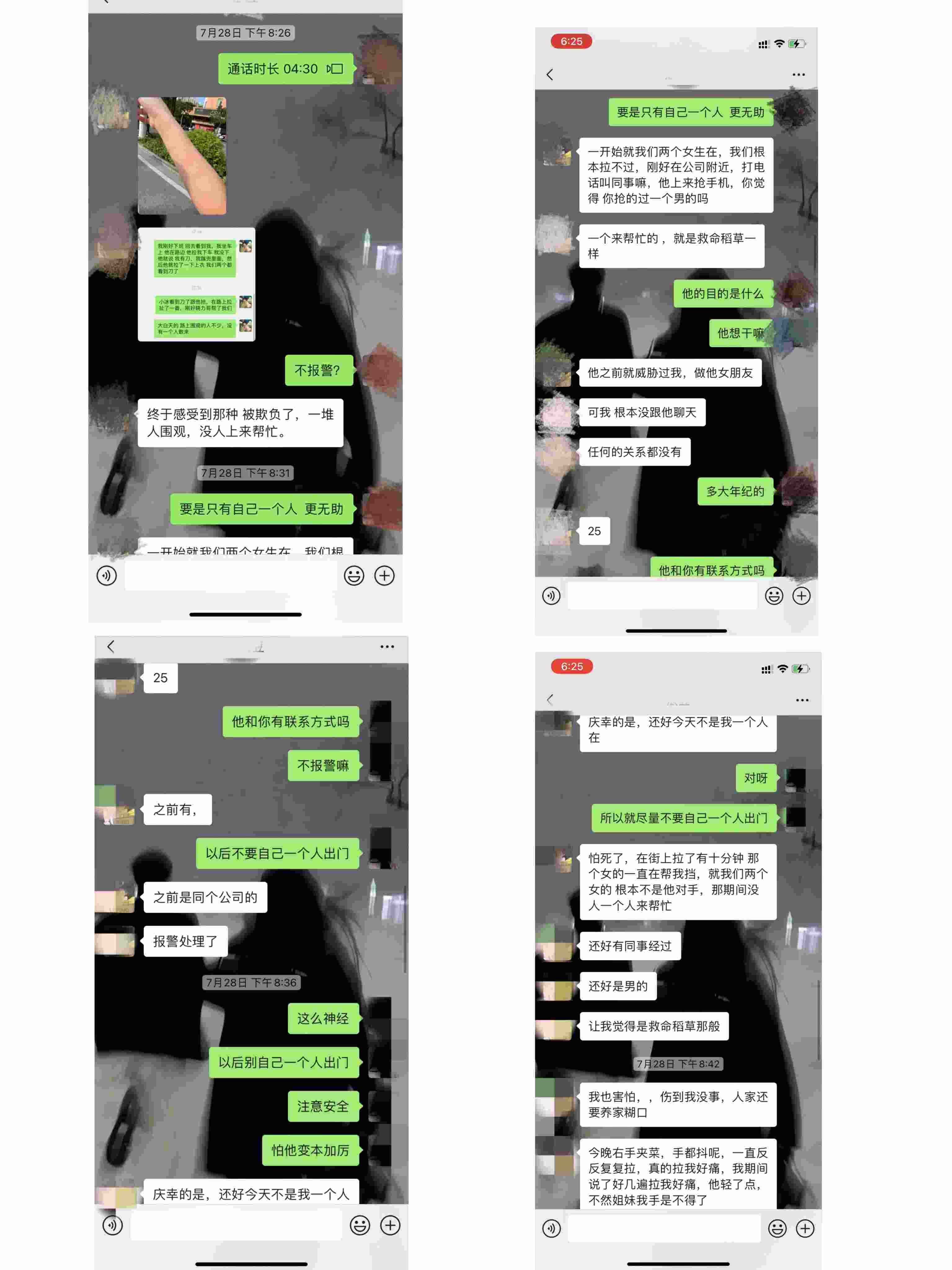 相關聊天截圖顯示,此次被黃某南威脅后,陳某萍和朋友在微信聊天時表示,“報警處理了”。陳某萍還表示,當時,黃某南拉她上衣時,她看到了刀,感到非常害怕,幸好有同事出手相助。“他之前就威脅過我,做他女朋友??晌腋緵]跟他聊天,任何關系都沒有。”