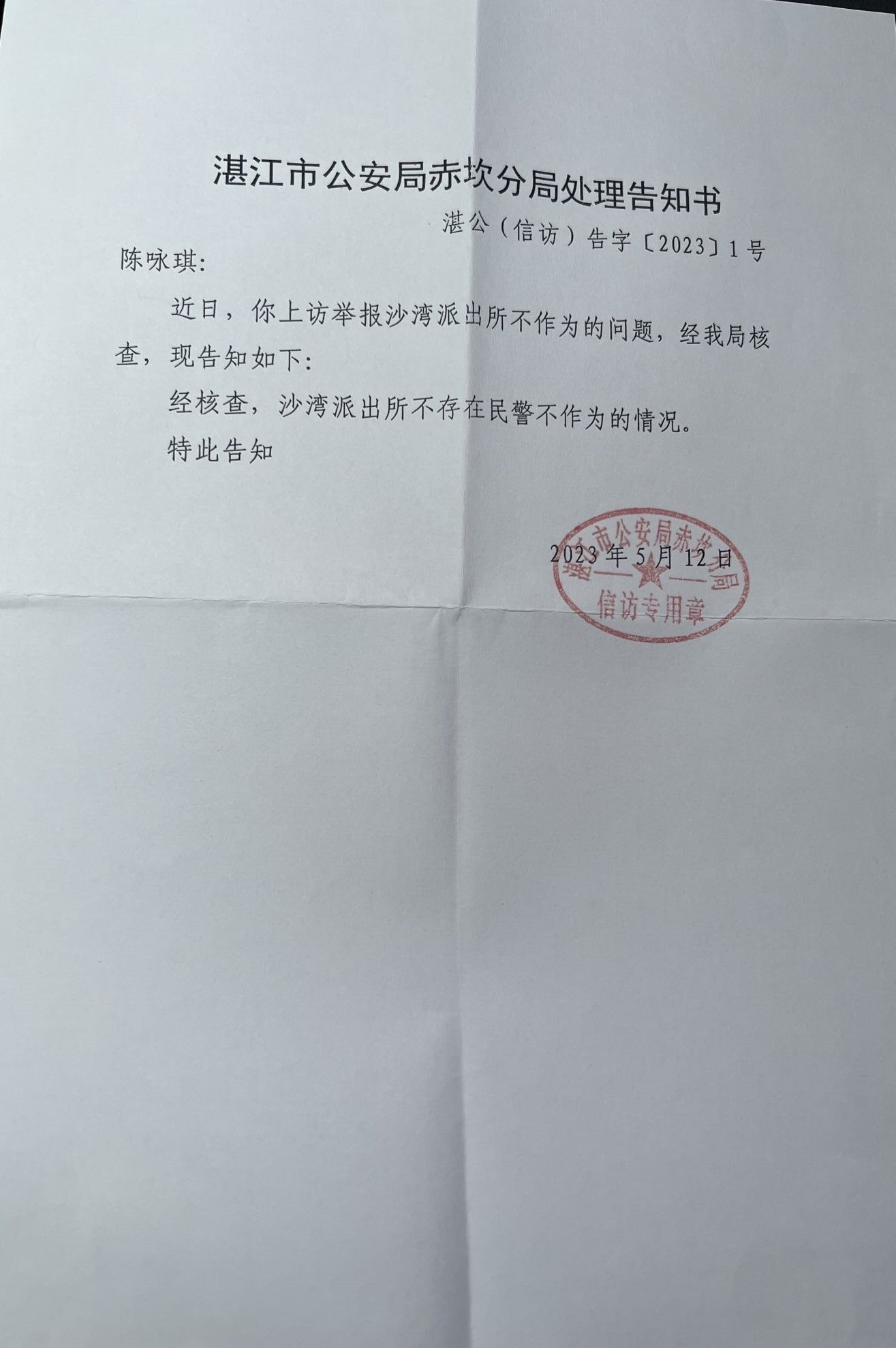 5月12日,湛江市公安局赤坎分局作出的《處理告知書》顯示,該公安分局表示,經核查,沙灣派出所不存在民警不作為的情況。