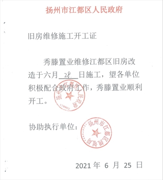 “搞定”西苑社區(qū)后,楊某軍偽造一份《揚(yáng)州市江都區(qū)人民政府舊房維修施工開(kāi)工證》,并加蓋“揚(yáng)州市江都區(qū)人民政府 178962”“揚(yáng)州市江都區(qū)規(guī)劃局”公章。周女士獲得該證后,立即組織顧先生進(jìn)場(chǎng)施工?!皸钅耻娮屛蚁葔|付材料款和人工費(fèi),后面等財(cái)政撥款就行。我就安排顧先生7月1日進(jìn)場(chǎng)施工?!?/p>