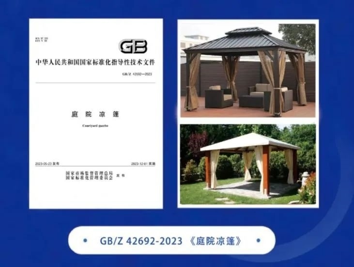 《庭院涼篷》國家標準化指導性技術文件自2023年12月1日起實施,該文件的制定和出臺將填補該類產品缺乏標準規(guī)范的空白,有利于庭院涼篷產品質量的提升以及行業(yè)的發(fā)展,為企業(yè)出口提供保障。文件首次對庭院涼篷從產品分類、原材料、外觀、產品完整性、尺寸、性能要求和安全要求等方面進行詳細規(guī)范。