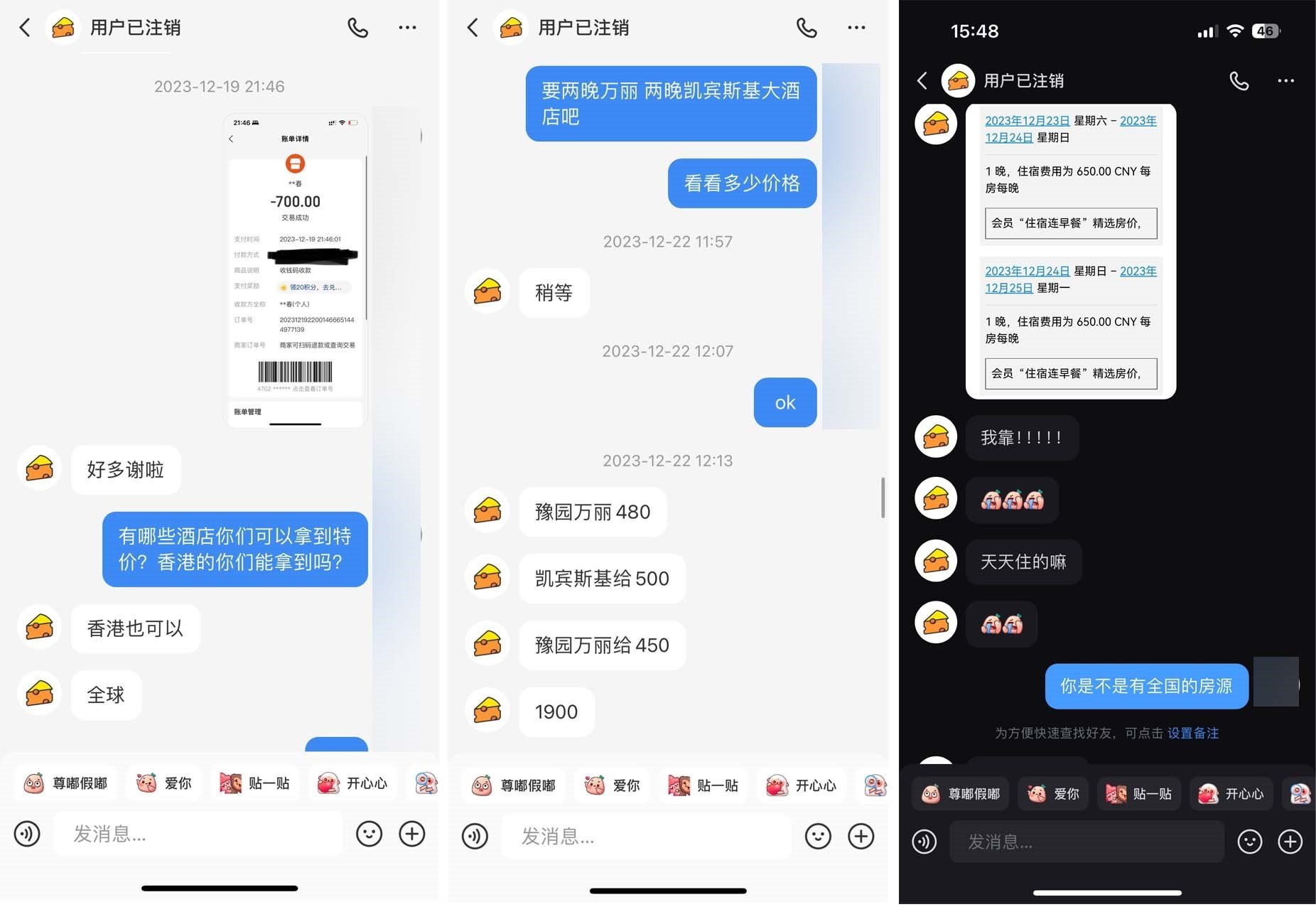 吳女士接受這份“報價”,后通過掃碼支付了700元房費并很快收到了訂房短信,成功入住該酒店。其間,她又經(jīng)“熬夜冠軍”推薦,預付了900元房費,托其代訂了上海外灘附近的另一家酒店。