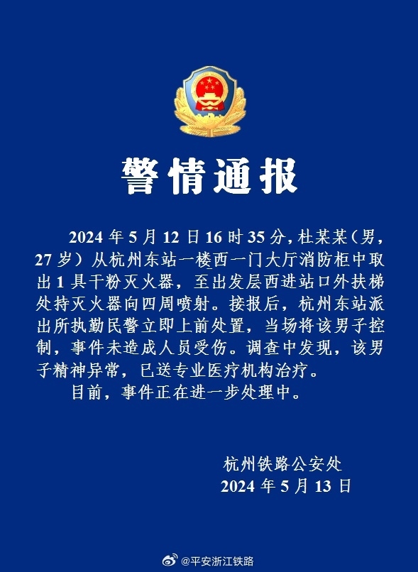 央視網(wǎng)消息:據(jù)“平安浙江鐵路”微博消息,杭州鐵路公安處5月13日通報(bào),2024年5月12日16時(shí)35分,杜某某(男,27歲)從杭州東站一樓西一門(mén)大廳消防柜中取出1具干粉滅火器,至出發(fā)層西進(jìn)站口外扶梯處持滅火器向四周?chē)娚?。接?bào)后,杭州東站派出所執(zhí)勤民警立即上前處置,當(dāng)場(chǎng)將該男子控制,事件未造成人員受傷。調(diào)查中發(fā)現(xiàn),該男子精神異常,已送專(zhuān)業(yè)醫(yī)療機(jī)構(gòu)治療。目前,事件正在進(jìn)一步處理中。