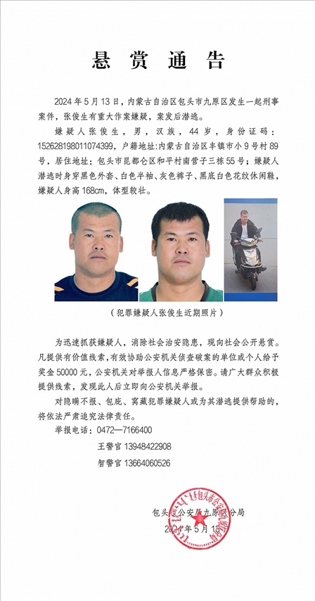 央視網(wǎng)消息:據(jù)平安九原公眾號消息,5月14日,包頭市公安局九原區(qū)分局發(fā)布懸賞通告,5月13日,包頭市九原區(qū)發(fā)生一起刑事案件,張俊生有重大作案嫌疑,案發(fā)后潛逃。為迅速抓獲嫌疑人,消除社會治安隱患,現(xiàn)向社會公開懸賞。凡提供有價(jià)值線索,有效協(xié)助公安機(jī)關(guān)偵查破案的單位或個(gè)人給予獎(jiǎng)金50000元,公安機(jī)關(guān)對舉報(bào)人信息嚴(yán)格保密。請廣大群眾積極提供線索,發(fā)現(xiàn)此人后立即向公安機(jī)關(guān)舉報(bào)。對隱瞞不報(bào)、包庇、窩藏犯罪嫌疑人或?yàn)槠錆撎犹峁椭模瑢⒁婪▏?yán)肅追究法律責(zé)任。