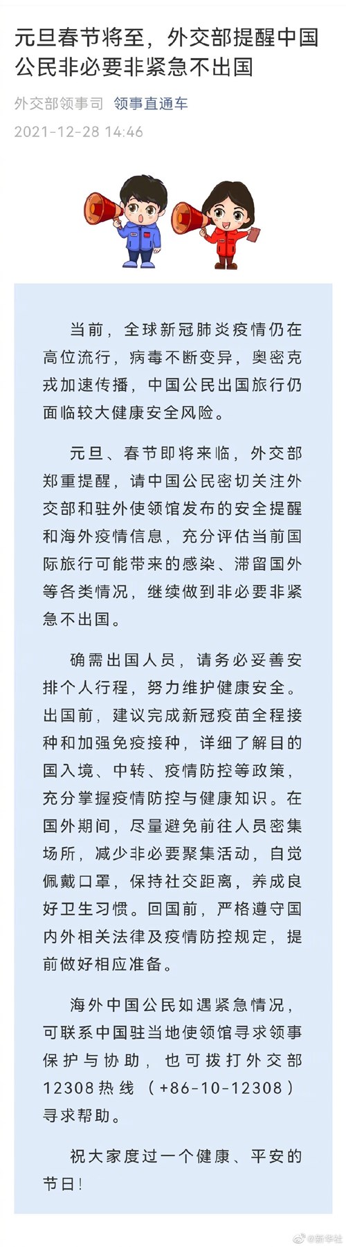 元旦、春節(jié)即將來(lái)臨,外交部鄭重提醒,請(qǐng)中國(guó)公民密切關(guān)注外交部和駐外使領(lǐng)館發(fā)布的安全提醒和海外疫情信息,充分評(píng)估當(dāng)前國(guó)際旅行可能帶來(lái)的感染、滯留國(guó)外等各類情況,繼續(xù)做到非必要非緊急不出國(guó)。