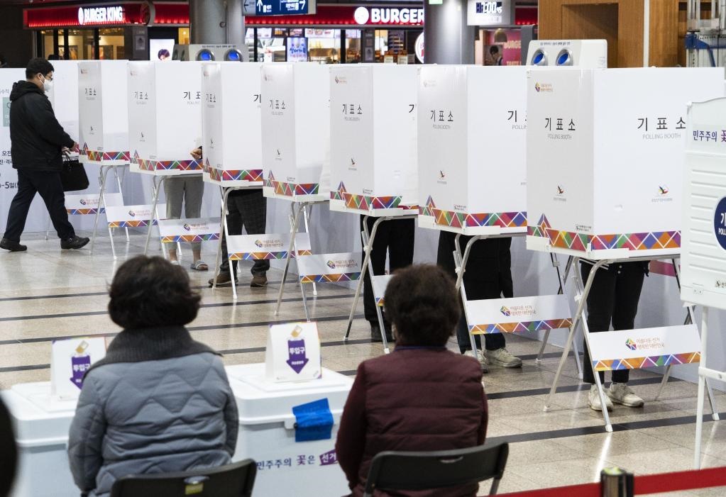 3月4日,選民在韓國首爾一個投票站填寫選票。(新華社發(fā),李相浩攝)