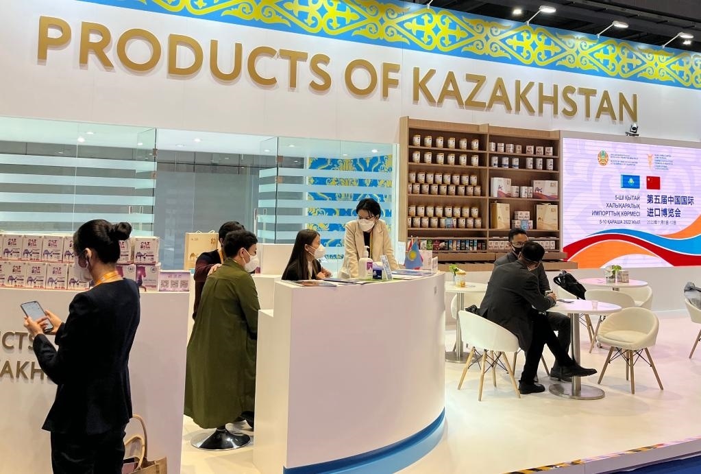 這是2022年11月6日在第五屆進(jìn)博會(huì)上拍攝的哈薩克斯坦產(chǎn)品展區(qū)。
