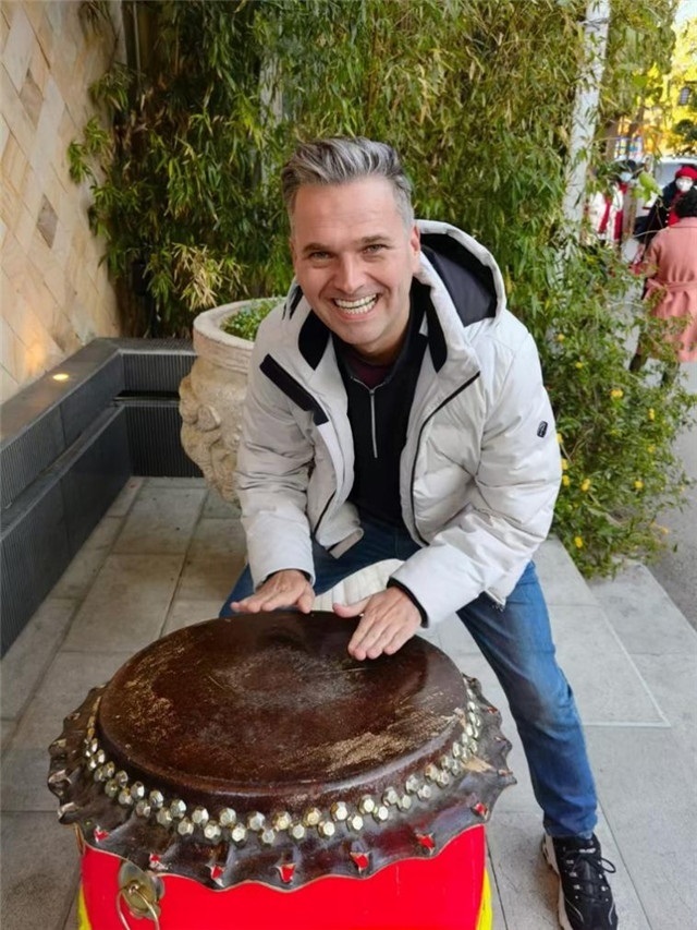 杜安睿在云南昆明街頭嘗試云南鼓。受訪者供圖