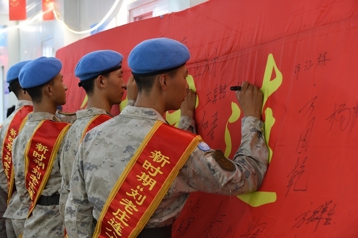 “劉老莊連”新評(píng)選的勇士在“勇士旗”上簽名。中國第九批赴南蘇丹(朱巴)維和步兵營供圖