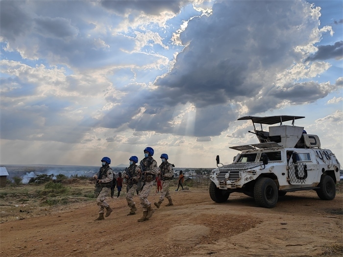 2022年12月,“劉老莊連”隨中國第九批赴南蘇丹(朱巴)維和步兵營奔赴維和戰(zhàn)場,重點(diǎn)擔(dān)負(fù)警戒巡邏、武裝護(hù)衛(wèi)、隔離沖突等維和任務(wù)。截至目前,“劉老莊連”累計(jì)行程1500余公里,高標(biāo)準(zhǔn)完成了各項(xiàng)授權(quán)任務(wù),受到聯(lián)南蘇團(tuán)各級(jí)高度贊揚(yáng)。這也是英雄的“劉老莊連”戰(zhàn)旗第一次飄揚(yáng)在非洲大地。