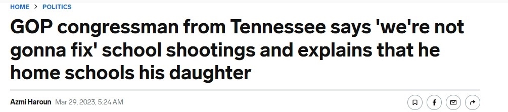 據(jù)美國(guó)《商業(yè)內(nèi)幕》新聞網(wǎng)站29日?qǐng)?bào)道,田納西州納什維爾市小學(xué)發(fā)生槍擊事件后,該州眾議院議員蒂姆·伯切特面對(duì)如果出現(xiàn)類似槍擊事件“該如何保護(hù)孩子”的質(zhì)問,直言并未找到解決方法,會(huì)讓他的女兒“在家讀書”。