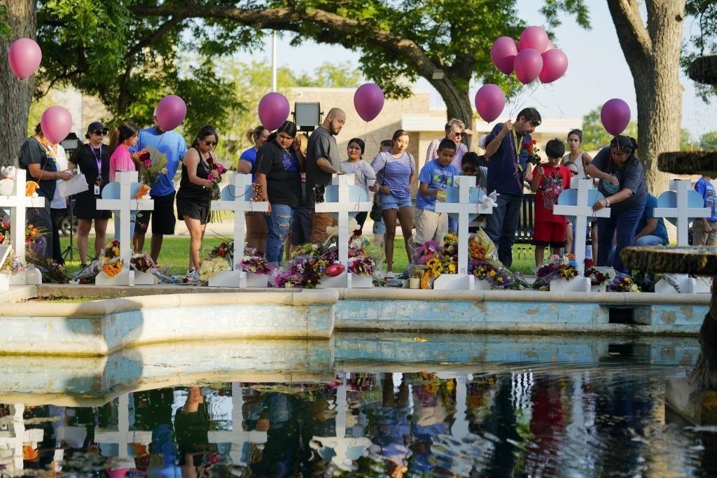 2022年5月26日,在美國(guó)得克薩斯州尤瓦爾迪市,人們哀悼槍擊事件遇害者。新華社記者吳曉凌攝