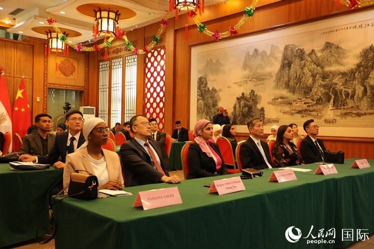 全體與會者共同觀看了阿文版《中國共產黨國際形象網宣片》。使館2名青年外交官代表結合自身工作經歷,分別以《從三個關鍵詞讀懂中共二十大重要意義》和《從十年之變看中國式現(xiàn)代化》為題,深入淺出闡釋中共二十大的時代意義和深遠影響,以及中國式現(xiàn)代化對發(fā)展中國家的重要啟示。開羅大學3名師生代表結合自身工作和學習經歷,積極分享對中國式現(xiàn)代化的認識和體會,高度評價中國發(fā)展成就,贊賞中國通過“一帶一路”合作助力埃及發(fā)展,表示愿為推動埃中關系進一步發(fā)展貢獻青春力量。
