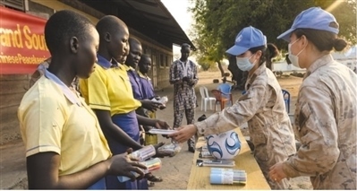 中國第九批赴南蘇丹(朱巴)維和步兵營長巡分隊官兵在丹蒙加拉為當?shù)貎和浰臀捏w用品。 中國赴南蘇丹(朱巴)維和步兵營供圖