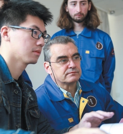 在葡萄牙塞圖巴爾理工學院魯班工坊,中方教師(左)為葡方師生介紹機電一體化設備。 葡萄牙塞圖巴爾理工學院魯班工坊供圖