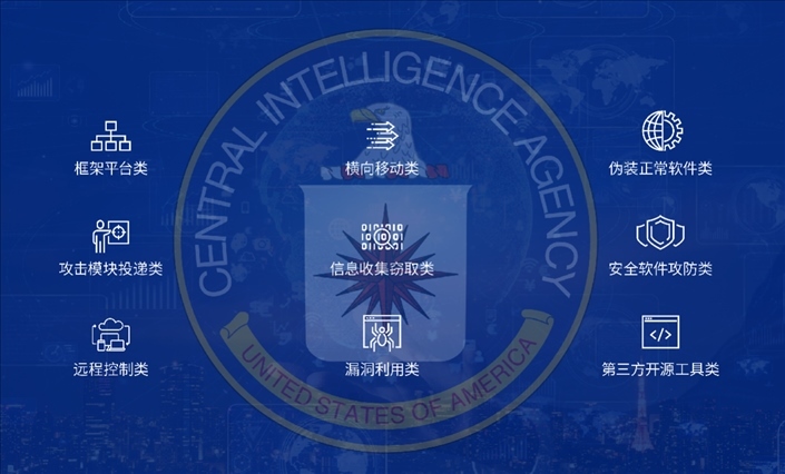 國(guó)家病毒應(yīng)急處理中心和360公司通過進(jìn)一步技術(shù)分析發(fā)現(xiàn),盡管CIA的后門程序和攻擊組件大都以無實(shí)體文件的內(nèi)存駐留執(zhí)行的方式運(yùn)行,這使得對(duì)相關(guān)樣本的發(fā)現(xiàn)和取證難度極大。即使這樣,聯(lián)合技術(shù)團(tuán)隊(duì)還是成功找到了解決取證難題的有效方法,發(fā)現(xiàn)了CIA所使用的9個(gè)類別的攻擊武器,包括攻擊模塊投遞類、遠(yuǎn)程控制類、信息收集竊取類、第三方開源工具類等。
