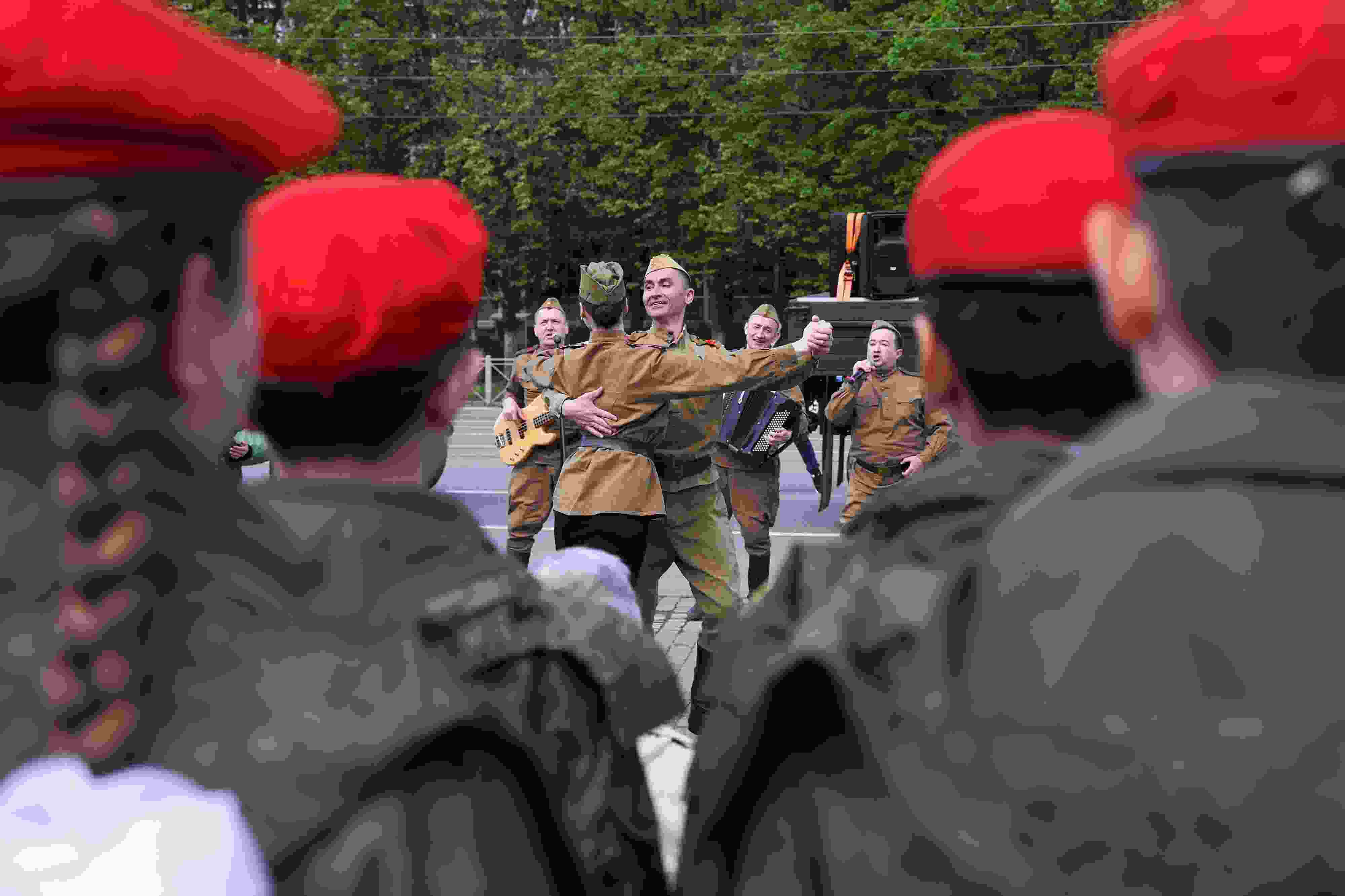 當(dāng)?shù)貢r(shí)間2023年5月8日,俄羅斯莫斯科,人們?cè)诩o(jì)念二戰(zhàn)勝利78周年的音樂會(huì)上表演。蘇聯(lián)解體后,俄羅斯自1995年起,在每年的5月9日舉行衛(wèi)國戰(zhàn)爭勝利日閱兵式及系列慶?;顒?dòng)。 視覺中國