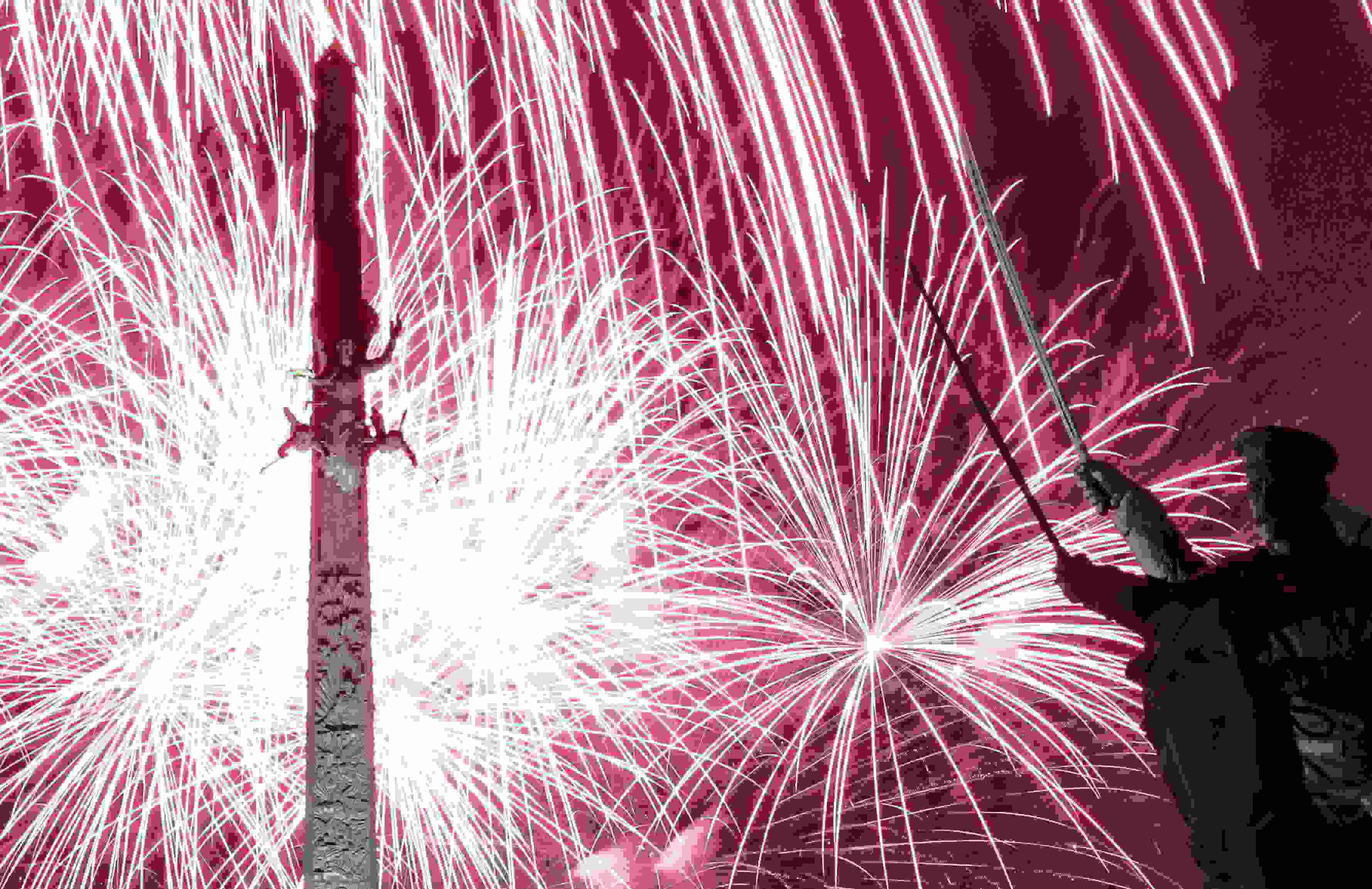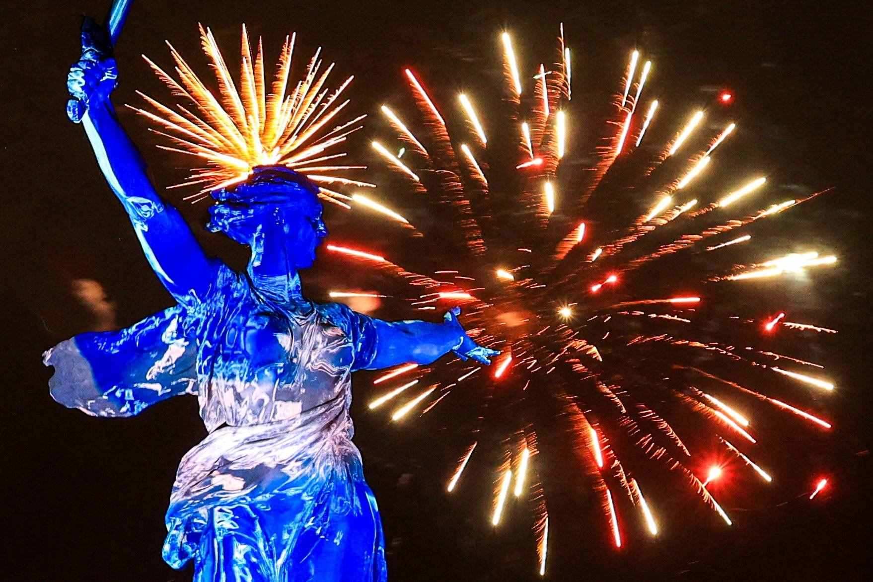當(dāng)?shù)貢r(shí)間2023年5月9日,俄羅斯伏爾加格勒,紀(jì)念衛(wèi)國(guó)戰(zhàn)爭(zhēng)勝利78周年,煙花在馬馬耶夫山崗的祖國(guó)召喚雕像上綻放。