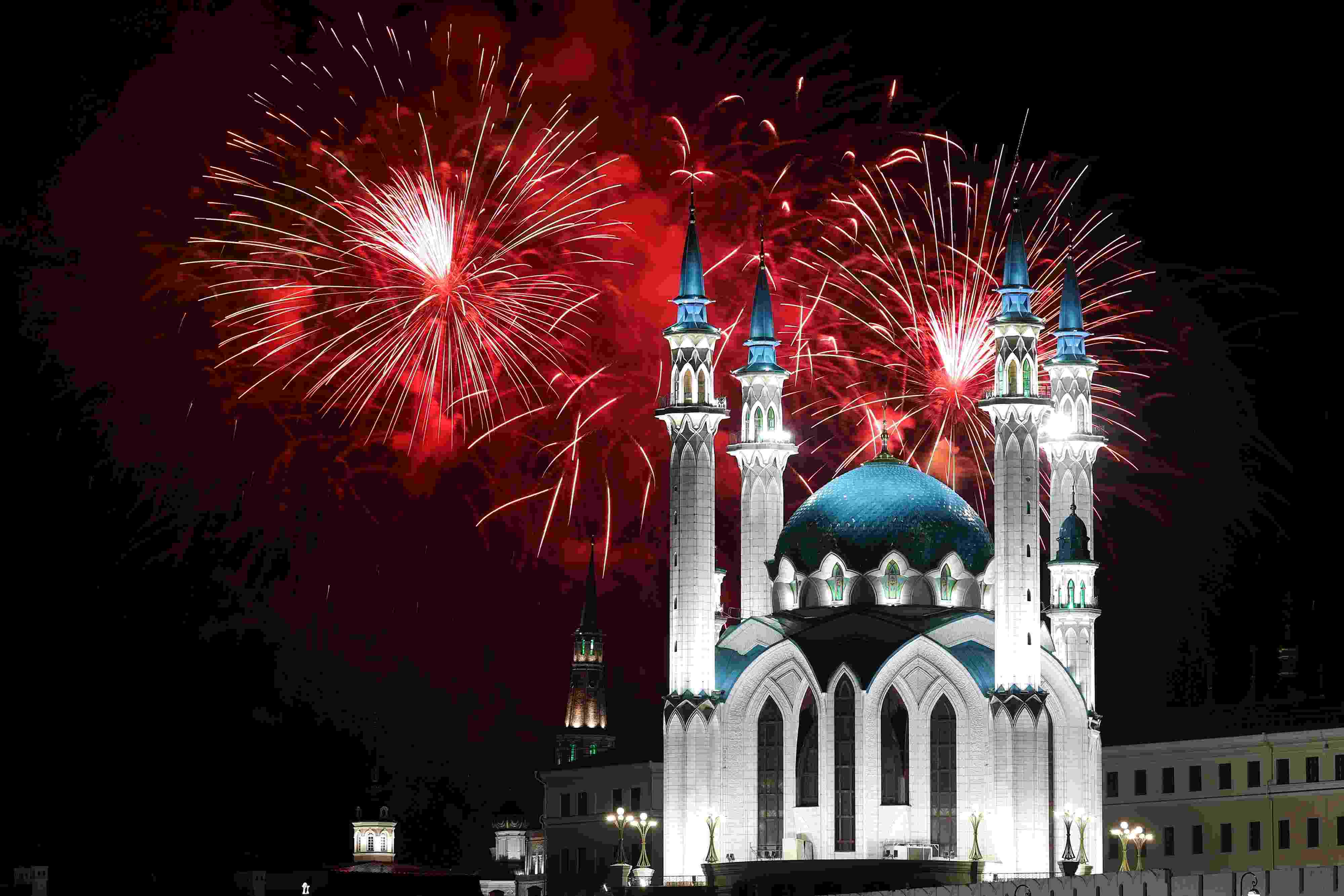 當(dāng)?shù)貢r(shí)間2023年5月9日,俄羅斯喀山,紀(jì)念衛(wèi)國(guó)戰(zhàn)爭(zhēng)勝利78周年,庫(kù)爾沙里夫清真寺燃放煙花。視覺中國(guó)