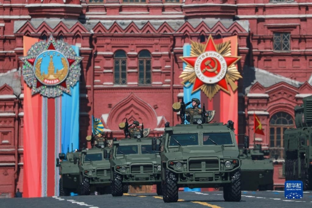 5月9日,在俄羅斯首都莫斯科,軍車編隊(duì)駛過(guò)紅場(chǎng)。