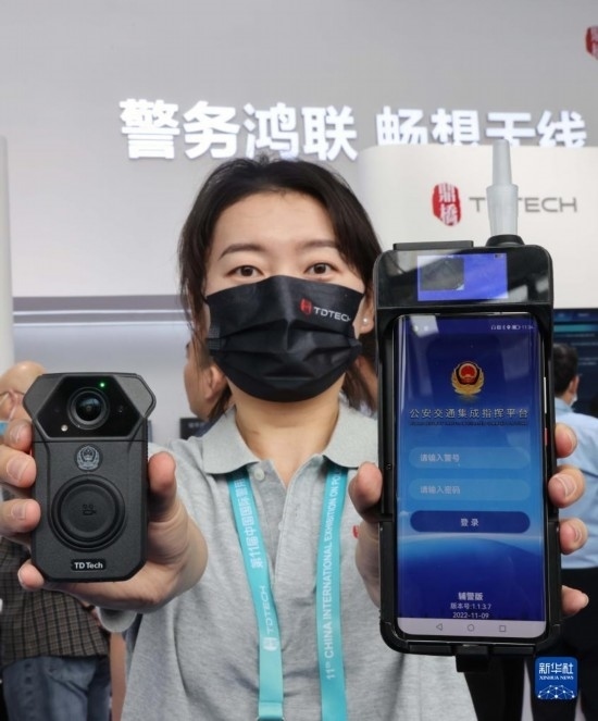 5月12日,工作人員在展示交警多功能移動警務(wù)終端(右)和5G執(zhí)法記錄儀。