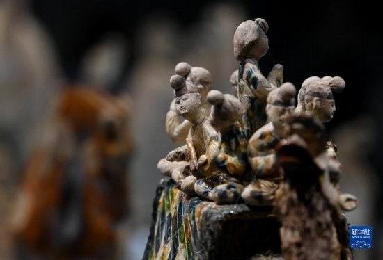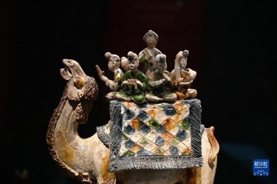 這是在陜西歷史博物館拍攝的唐三彩駱駝?shì)d樂(lè)俑(5月11日攝)。這件唐三彩駱駝?shì)d樂(lè)俑既是唐代文化藝術(shù)、制作工藝發(fā)達(dá)昌盛的重要物證,也見(jiàn)證了絲綢之路上藝術(shù)的交流與融合。