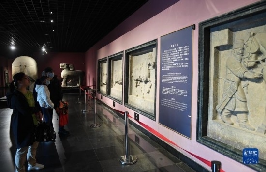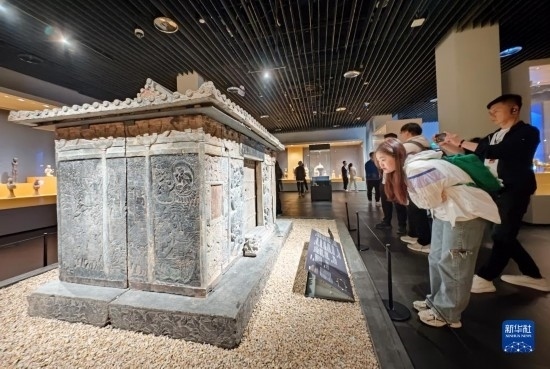 5月8日,游客在西安博物院參觀(guān)史君墓石槨。墓主史君是北周涼州薩保,粟特人。石槨整體為中國(guó)傳統(tǒng)歇山頂?shù)钐檬浇ㄖ谋诟〉駜?nèi)容和風(fēng)格則帶有鮮明的西域特色。