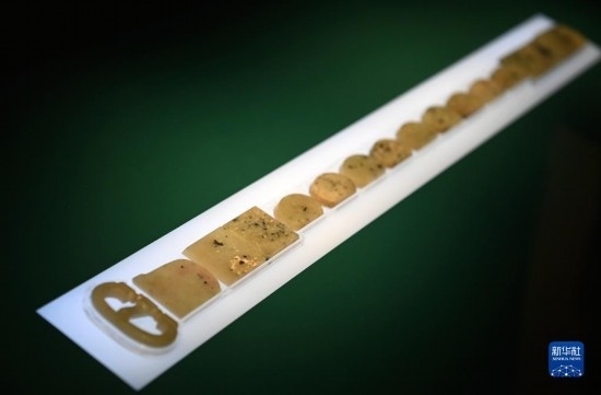 這是在陜西歷史博物館拍攝的骨咄玉帶銙(5月11日攝)。“骨咄”即珂咄羅,是位于今塔吉克斯坦和阿富汗之間的中亞小國(guó),史籍記載與唐王朝交往密切。