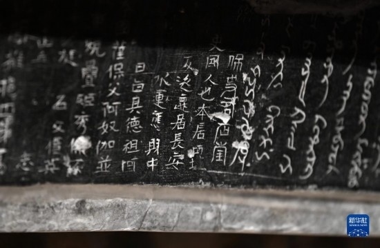 這是在西安博物院展出的史君墓石槨,槨門(mén)門(mén)楣上用漢文和粟特文刻著墓主墓志(5月8日攝)。墓主史君是北周涼州薩保,粟特人。石槨整體為中國(guó)傳統(tǒng)歇山頂?shù)钐檬浇ㄖ谋诟〉駜?nèi)容和風(fēng)格則帶有鮮明的西域特色。