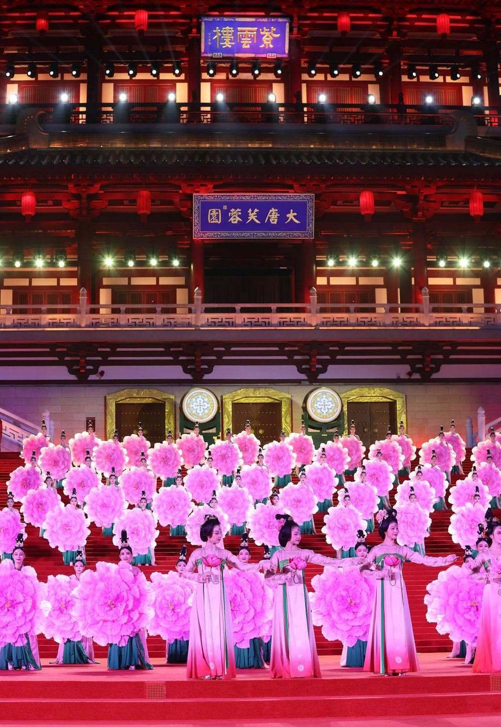 習近平夫婦為貴賓舉行唐朝傳統(tǒng)迎賓儀式。紫云樓前,禮樂和鳴,明快有力的古代佾舞、絢麗婀娜的芙蓉花舞,表達了古都西安人民的熱情好客,體現(xiàn)了中華文化兼容并蓄的精神風貌。