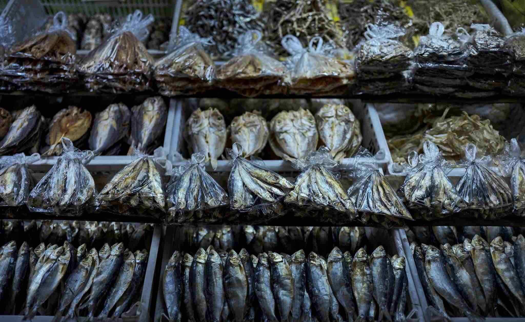 當(dāng)?shù)貢r間2023年4月19日,菲律賓馬尼拉菜市場上,用塑料袋包裹著的魚干。