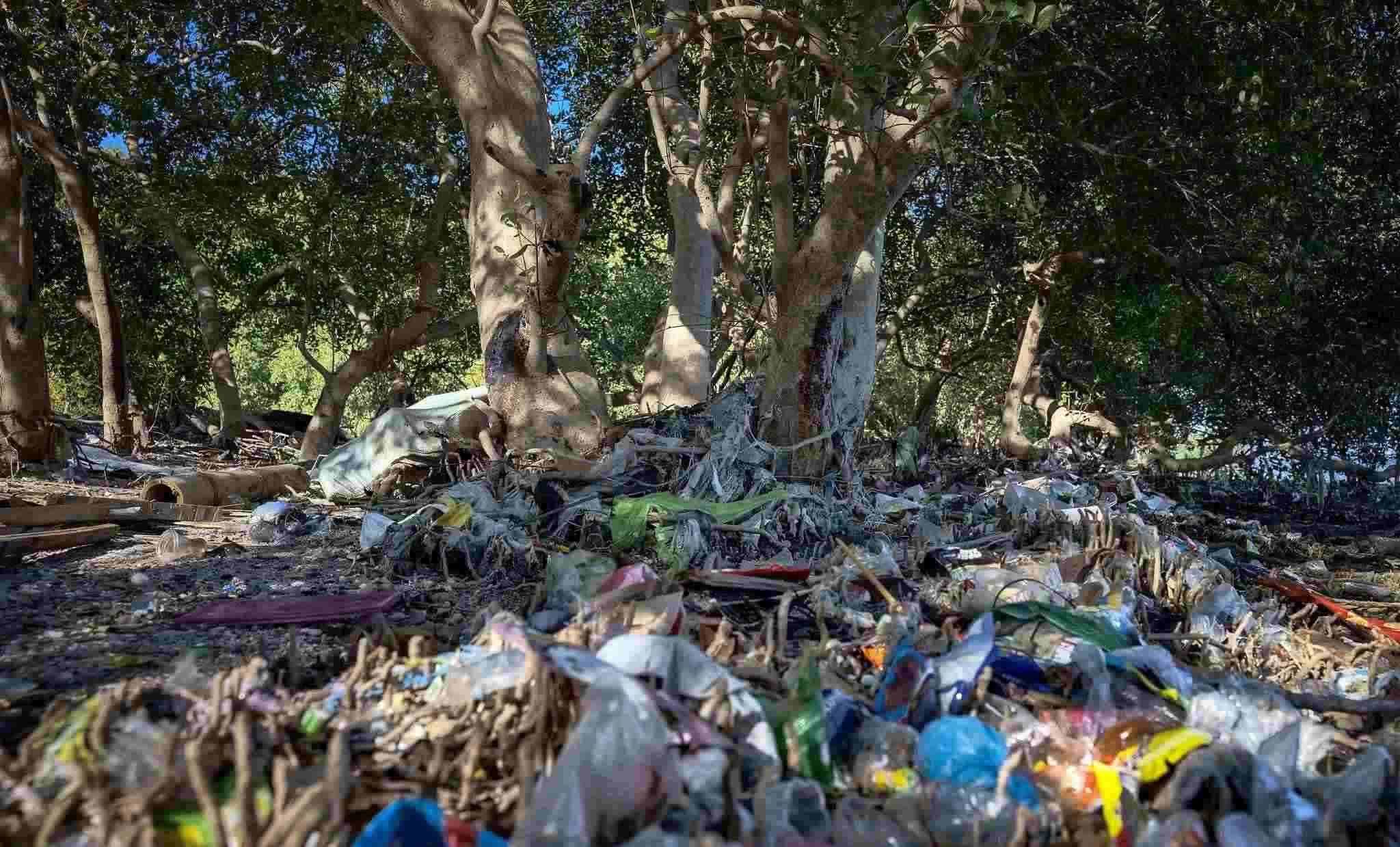 當(dāng)?shù)貢r間2023年4月19日,菲律賓馬尼拉,帕拉納克,自由島紅樹林上的塑料垃圾。