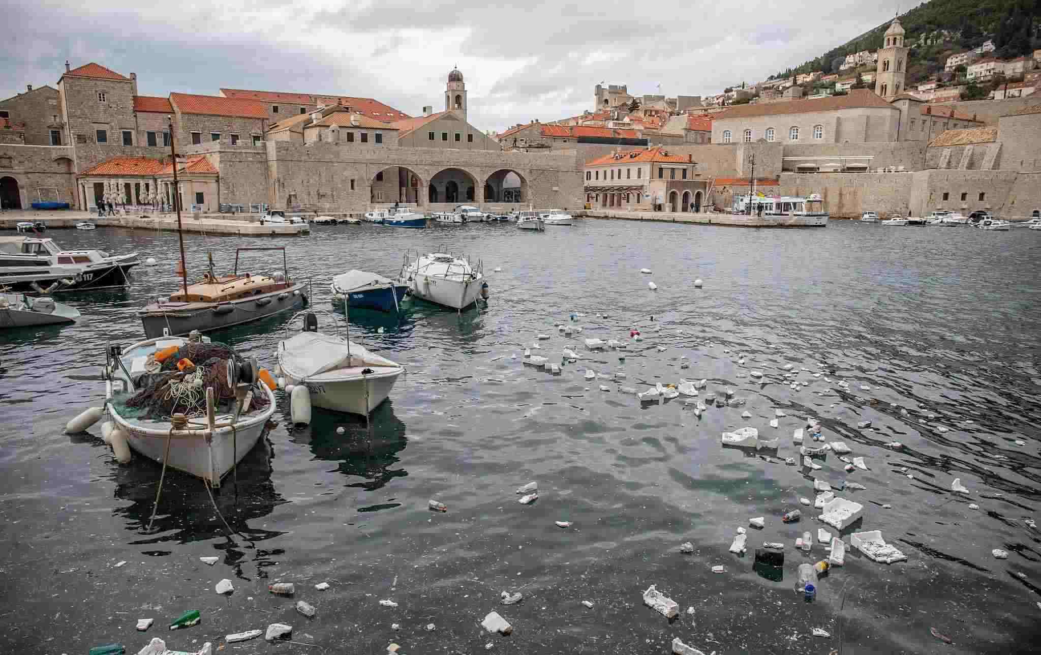 當(dāng)?shù)貢r間2023年2月27日,克羅地亞杜布羅夫尼克,大風(fēng)過后,塑料垃圾漂浮在舊城港口。