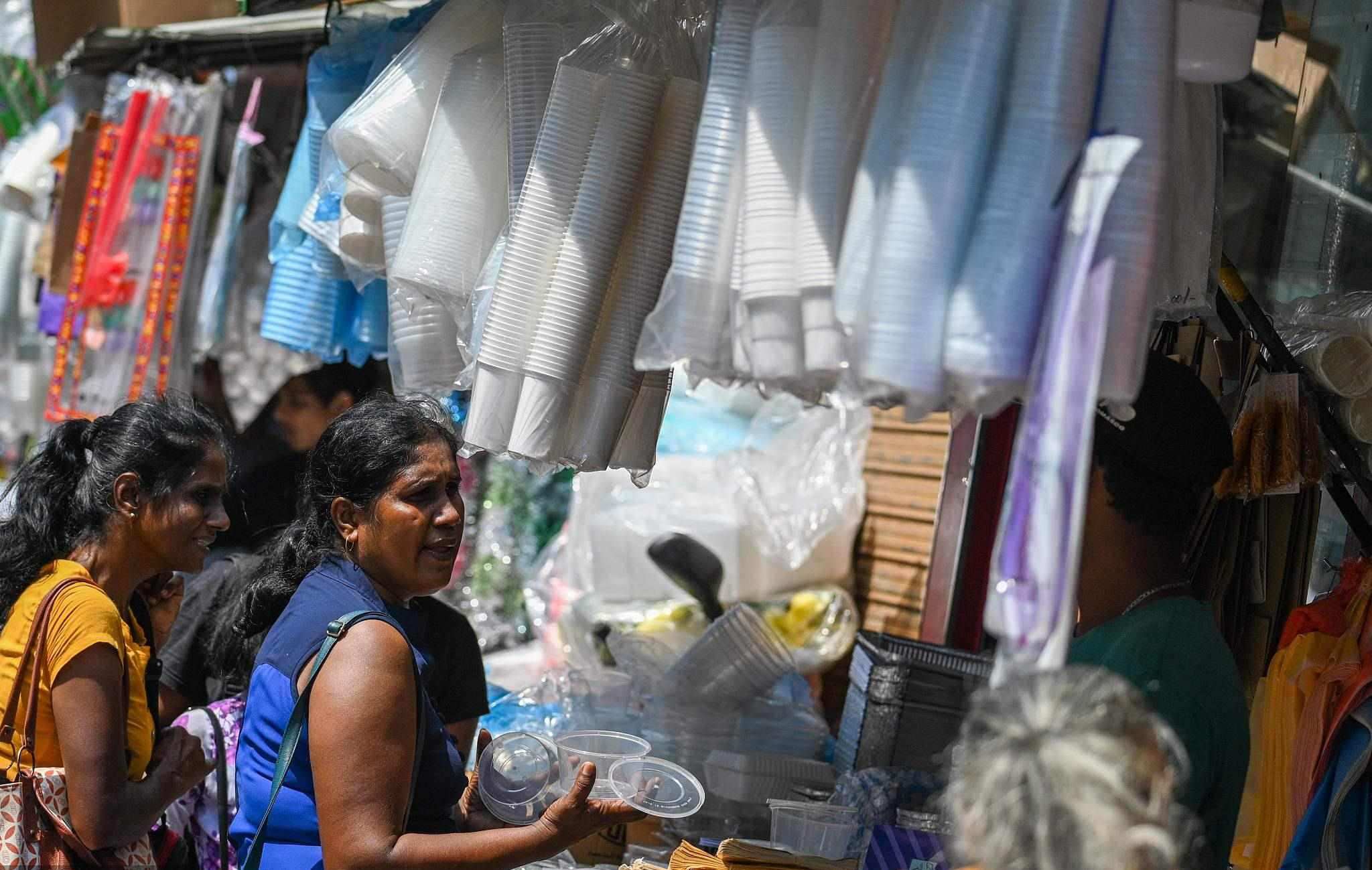 當(dāng)?shù)貢r間2023年2月14日,斯里蘭卡科倫坡市場的一家商店里,顧客在購買塑料餐具。