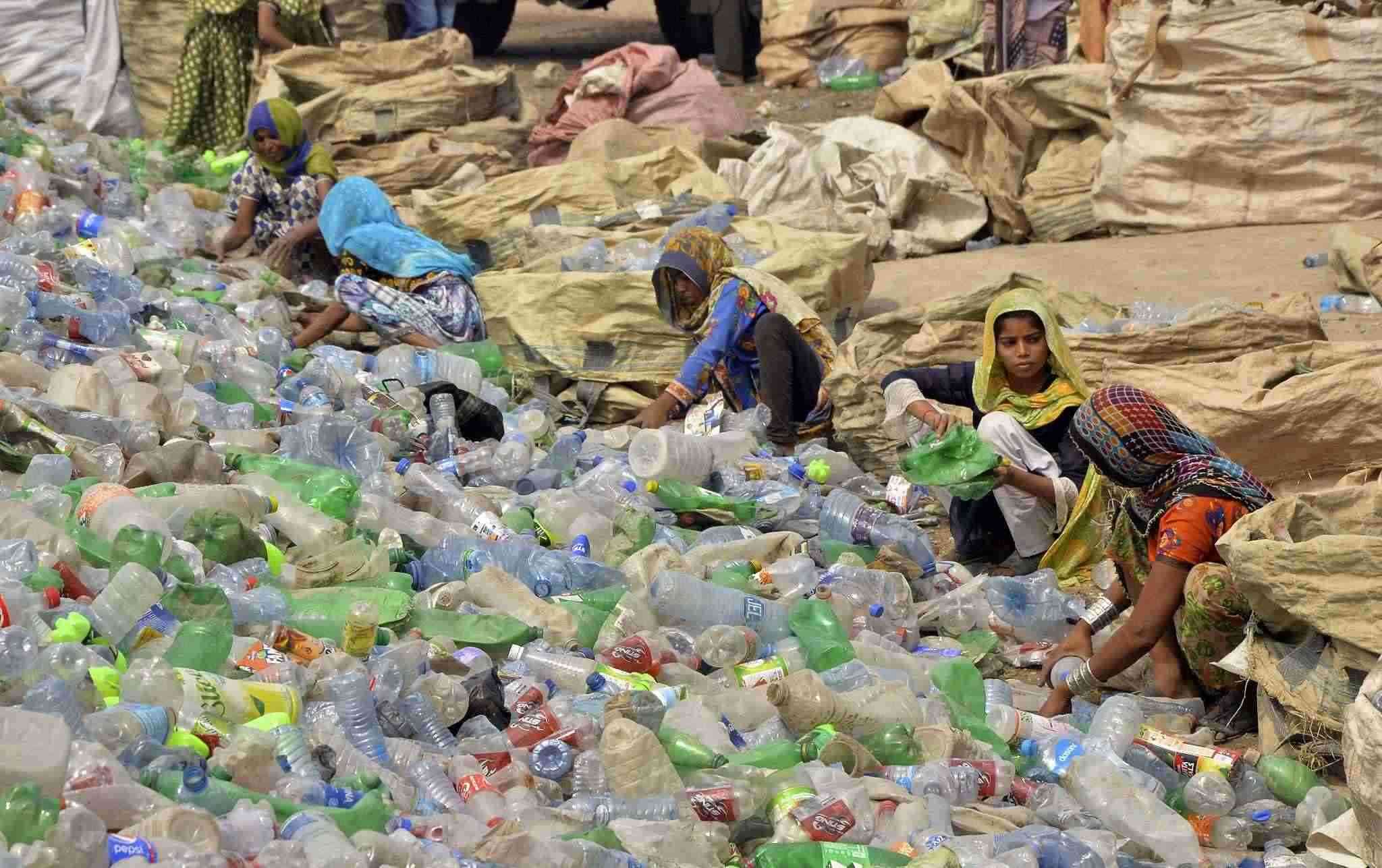 當(dāng)?shù)貢r間2023年4月30日,巴基斯坦海得拉巴,婦女們在一家塑料回收工廠里整理空瓶子。