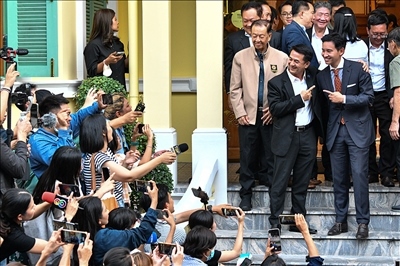 當(dāng)?shù)貢r間2023年5月17日,泰國曼谷,泰國遠進黨黨魁皮塔與泰國為泰黨黨魁春拉南在與聯(lián)盟伙伴舉行會議后合影。