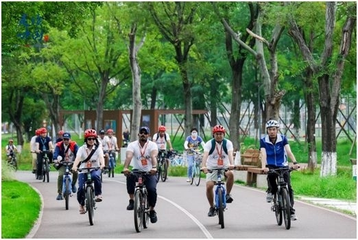 直播記錄下了外媒記者們騎行打卡世界規(guī)模最大的綠道系統(tǒng)——天府綠道核心“一軸”錦江綠道的全程:從鳥語花香的桂溪生態(tài)公園出發(fā),在綠樹掩映的婚姻登記所簽訂“城市婚書”,在亞洲最大單體建筑新世紀(jì)環(huán)球中心南側(cè)濕地學(xué)習(xí)四川話,在錦城湖4號(hào)湖畔撞線……