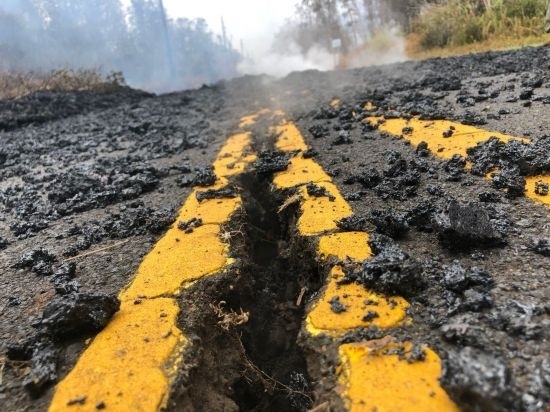 2018年5月9日,在美國(guó)夏威夷帕霍阿鎮(zhèn)附近的“莉拉妮地產(chǎn)”居民區(qū),火山活動(dòng)造成地面出現(xiàn)裂縫。新華社記者陶希夷攝